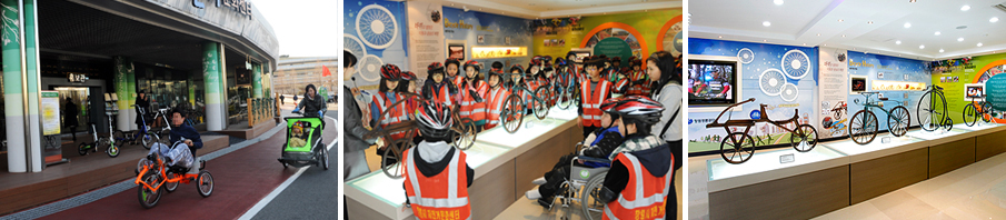 자전거문화센터 전시내부와 이곳을 견학중인 청소년들, 시민이 체험용 자전거를 이용중인 모습