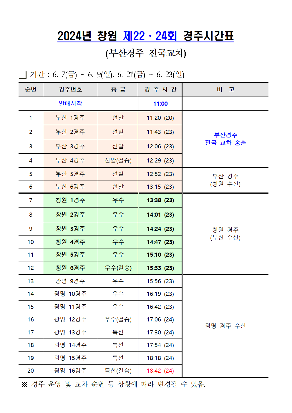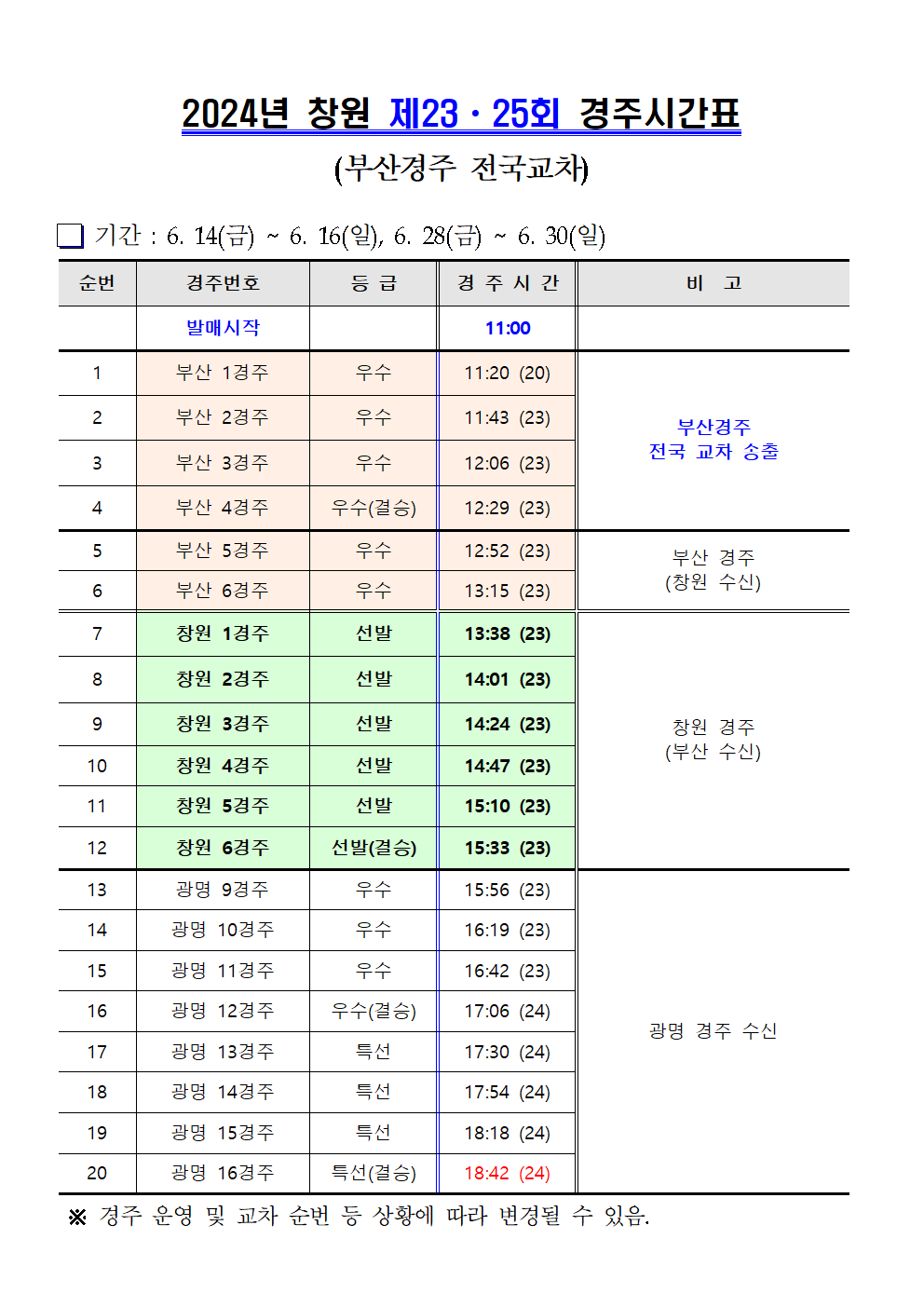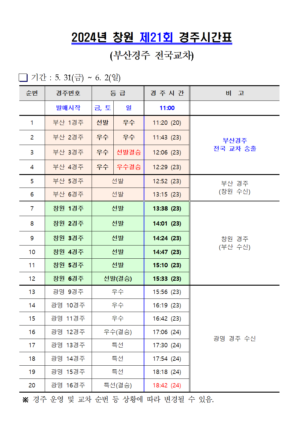 | 창원경륜 6월 (제21~25회) 경주시간표 안내 | |