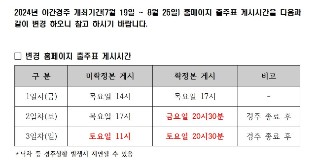 | 하절기 야간경륜 개최기간(7월 19일 ~ 8월 25일) 홈페이지 출주표 게시시간 변경 공지(부산 수신경주) | |